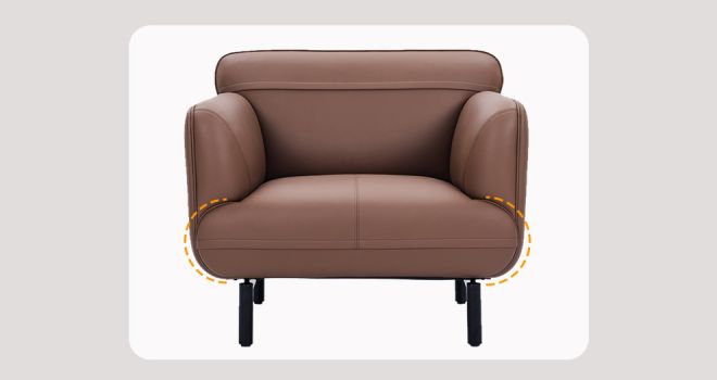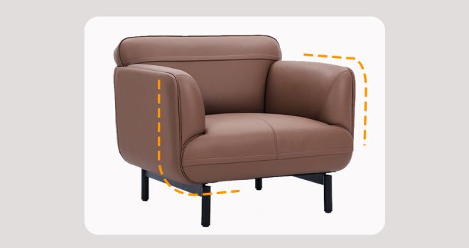 Zewnętrzny kontur ma duże zaokrąglone narożniki, a zewnętrzna strona podłokietnika ma ścięte krawędzie.